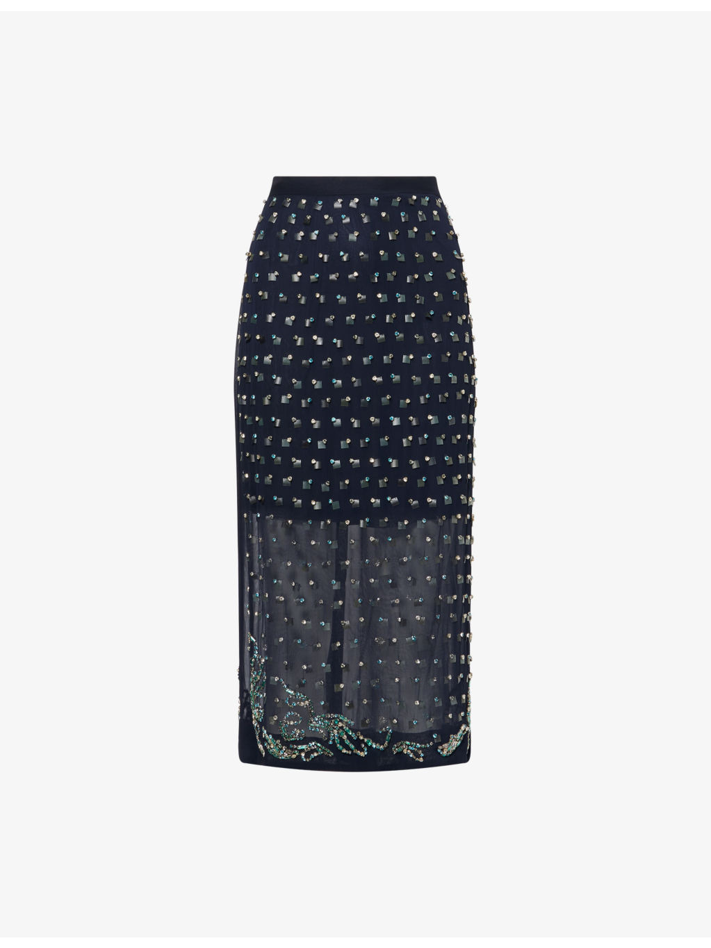 PRODUCT DETAILS - Dries Van Noten woven skirt - 100% viscose; lining 100% silk - Concealed zip fastening at back - Flat waistband, all-over embellished detailing, centre slit at back, elasticated waist at lining, half lined - Dry clean - Made in India - True to size - Size UK 6: length 31.4in / 80cm - Model is 5ft 10in/1.78m and wears a size UK 6 - Lightweight, non-stretch Ref: R04495758