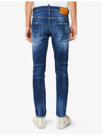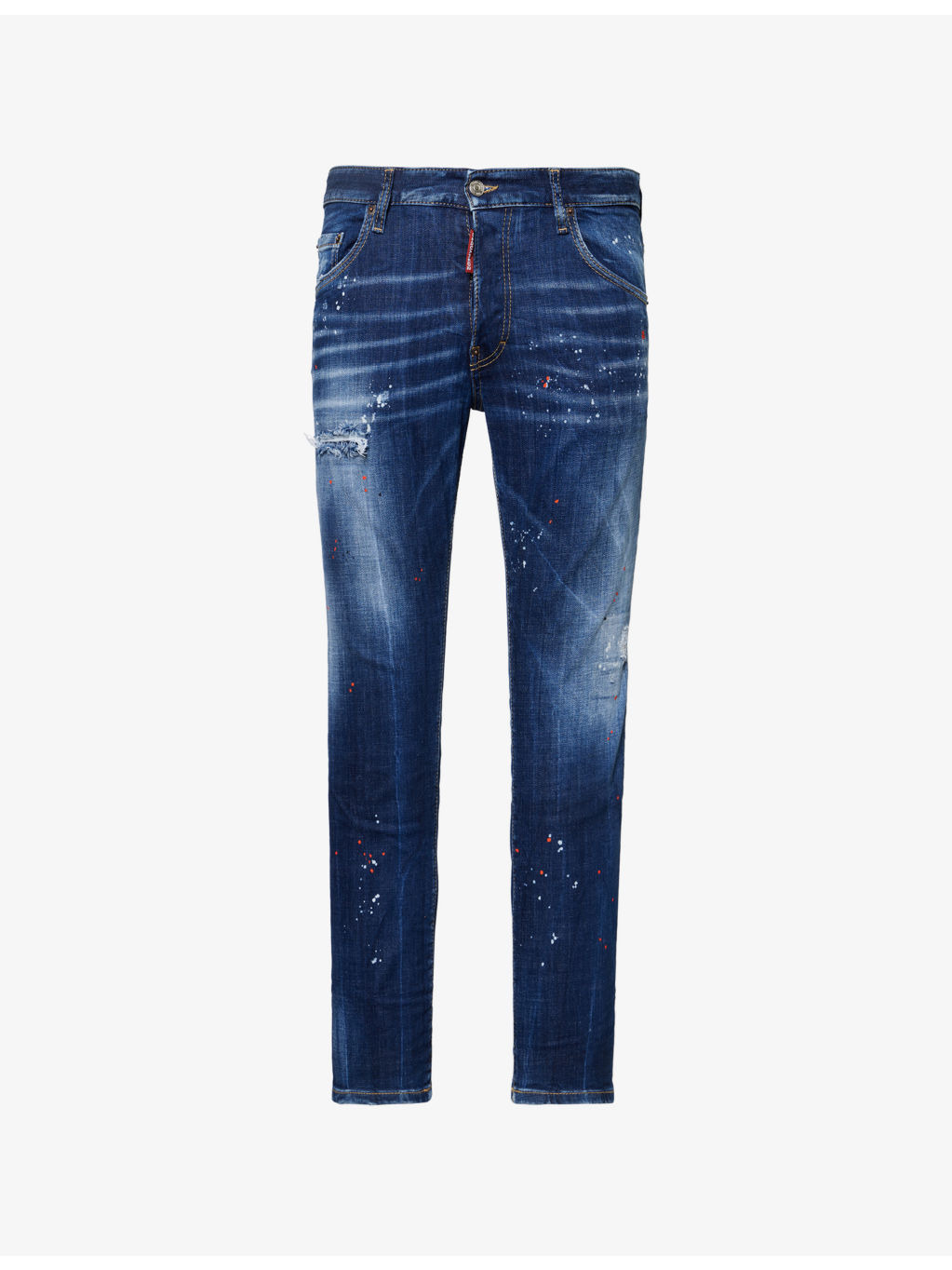 PRODUCT DETAILS - Dsquared2 denim jeans - 100% cotton - Button and zip-fly fastening - Mid rise, slim fit, five pockets, brand patch at back, belt loops, paint marks and detailing, mid wash - Machine wash at 30°C - Model is 6ft 2in/1.88m and wears a size UK 32 - Midweight, slight stretch Ref: R04475852