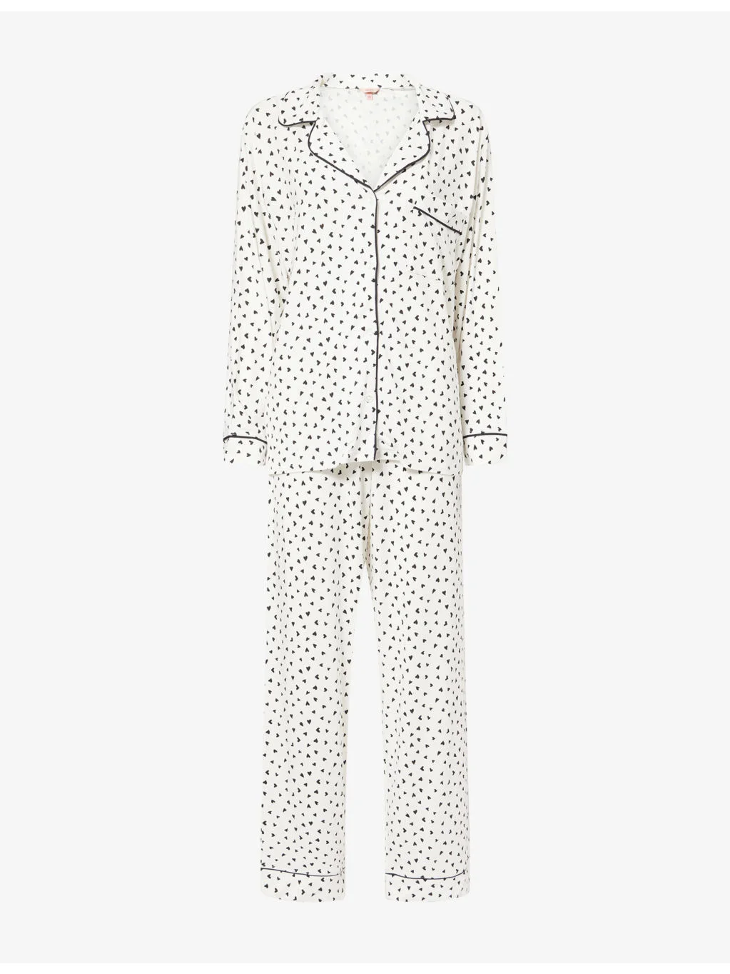 PRODUCT DETAILS - Eberjey stretch-woven pyjama set - 95% modal, 5% elastane - Exposed button fastening at front - Top: relaxed fit, V-neck, camp collar, long sleeves, patch pocket at front, all-over mountain landscape print, contrast piping - Bottoms: relaxed fit, mid-rise, straight leg, elasticated waistband, all-over mountain landscape print, contrast piping - Machine wash at 30°C - True to size - Model is 5ft 10in/1.78m and wears a size small - Lightweight, stretchy Ref: R04537311