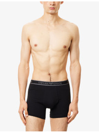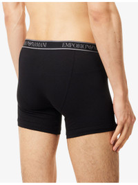 PRODUCT DETAILS - Emporio Armani pack of three stretch-cotton boxers - 95% cotton, 5% elastane; contrast 85% polyester, 15% elastane; lining 95% cotton, 5% elastane - Mid-rise, branded elasticated waistband, supportive panel at front - Machine wash at 30°C - Model is 6ft 2in/1.88m and wears a size medium - Lightweight, stretchy - For hygiene reasons, we are unable to exchange or refund this product, unless faulty. Ref: R04544012