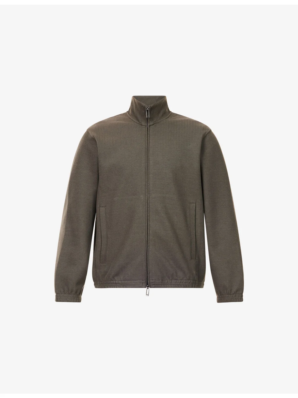 PRODUCT DETAILS - Emporio Armani stretch-cotton jacket - 46% lyocell, 46% cotton, 8% elastane - Concealed zip fastening - Funnel neck, long sleeves, two welt pockets at front, elasticated trims, metal hardware, all-over chevron-jacquard pattern - Machine wash at 30°C - Model is 6ft 2in/1.88m and wears a size medium - Midweight, stretchy Ref: R04556417