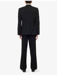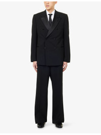 PRODUCT DETAILS - Emporio Armani wool-silk blend tuxedo suit - 96% wool, 4% elastane; contrast 57% polyester, 43% silk - Exposed button fastening at front - Jacket: double-breasted, peak lapel, long sleeves, buttoned cuffs, three welt pockets at front, lined - Waistcoat: V-neck opening, sleeveless, double-breasted, darted, adjustable tab at back - Trousers: straight leg, ribbon detailing at side, two slip, pockets at front, two welt pockets at back - Dry clean only - Made in Italy - Jacket: Size UK 42: length 33.4in / 85cm, chest 41.7in / 106cm - Waistcoat: UK 42: length 24in / 61cm, chest 40.1in / 102cm - Trousers: Size UK 42 : rise 13.3in / 34cm, inside leg 33.8in / 86cm, leg opening 22in / 56cm - Model is 6ft 2in/1.88m and wears a size UK 40 - Midweight, non-stretch Ref: R04537663