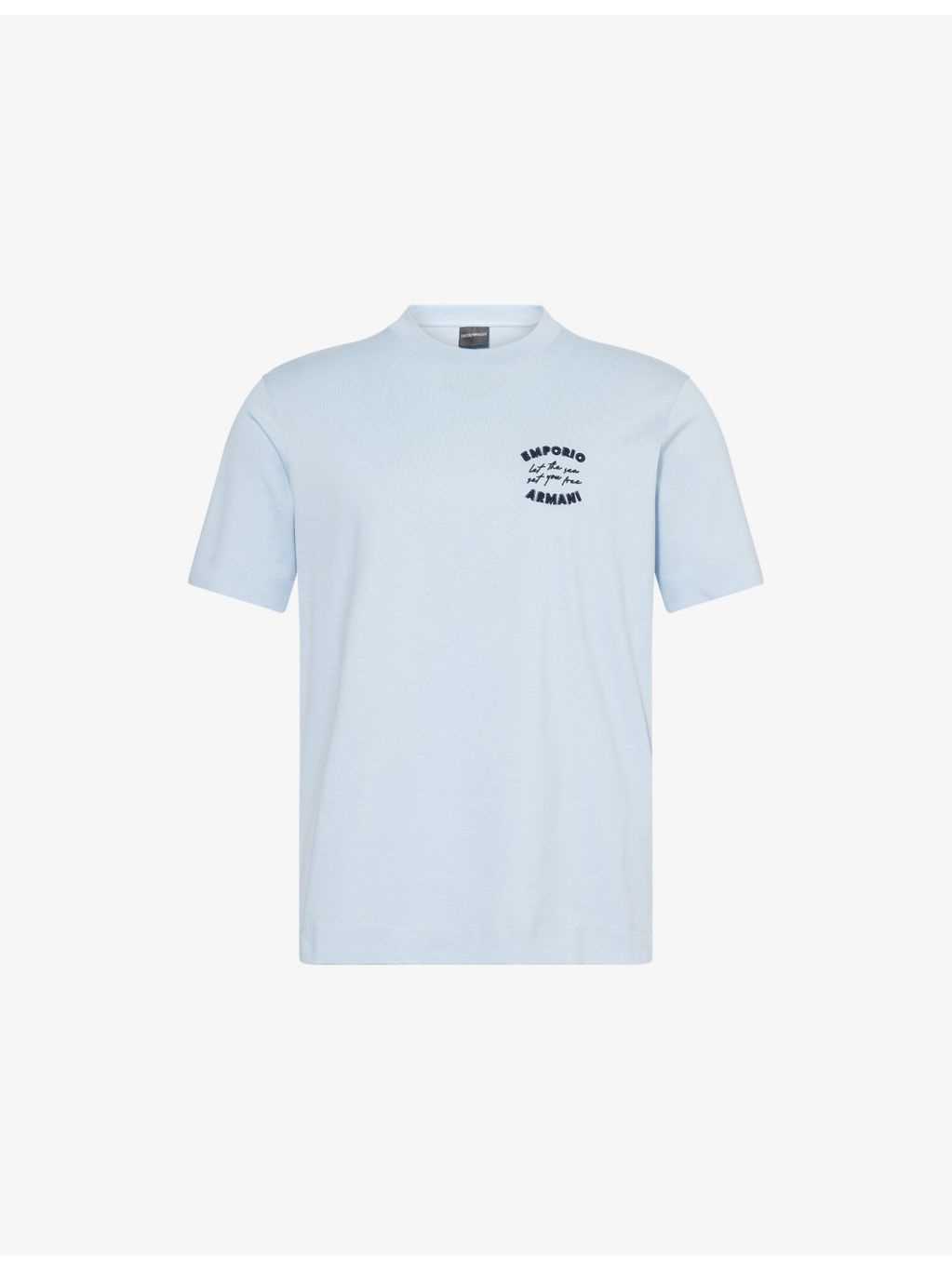 PRODUCT DETAILS - Emporio Armani cotton-jersey T-shirt - 100% cotton - Regular fit, ribbed crewneck, short sleeves, brand and text embroidery at front - Machine wash at 30°C - Made in Bulgaria - Model is 6ft 2in/1.88m and wears a size medium - Lightweight, stretchy Ref: R04463577