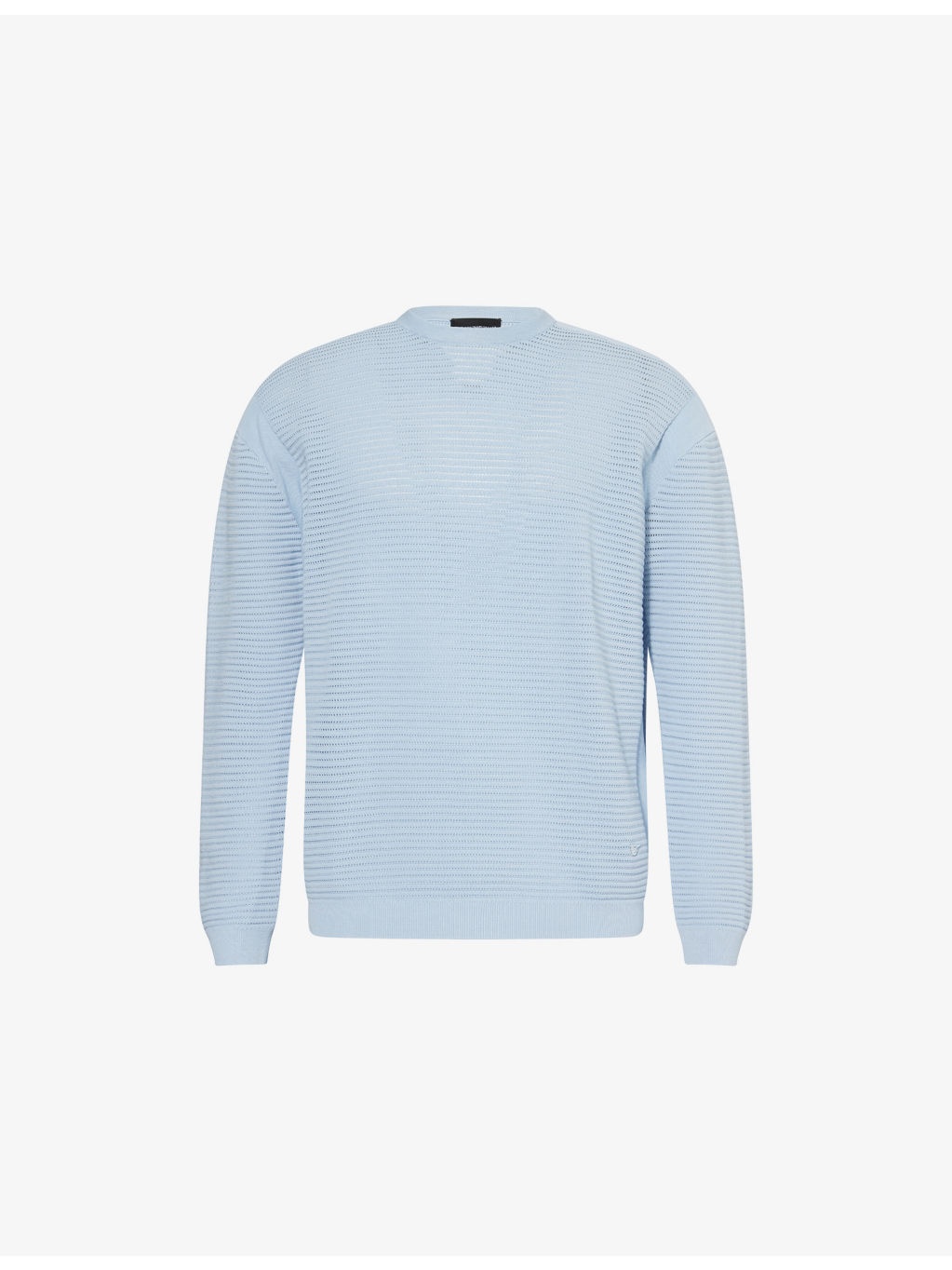 PRODUCT DETAILS - Emporio Armani cotton-knit jumper - 100% cotton - Relaxed fit, crewneck, long sleeves, brand embroidery at front, all-over cut-out pattern, textured, all-over knitted, ribbed trims - Hand wash cold - Model is 6ft 2in/1.88m and wears a size medium - Midweight, stretchy Ref: R04463568
