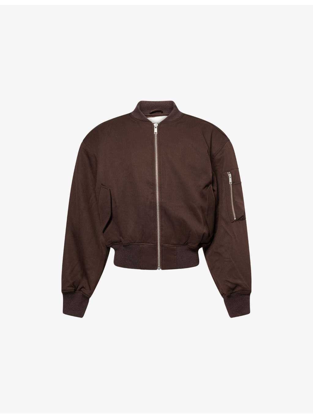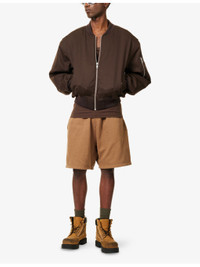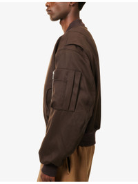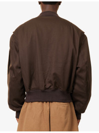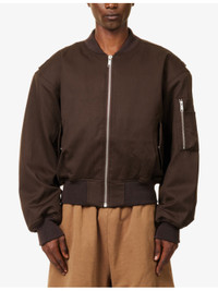 PRODUCT DETAILS - Entire Studios wool bomber jacket - 100% wool - Exposed zip fastening at front - Relaxed fit, band collar, shoulder pads, long sleeves, ribbed-knit trims, two side flap pockets, action flap at back, quilted lining, cropped - Machine wash at 30°C - Size medium: length 60cm / 25.9in, chest 134cm / 52.7in - Model is 6ft 2in/1.88m and wears a size medium - Lightweight, non-stretch Ref: R04479887