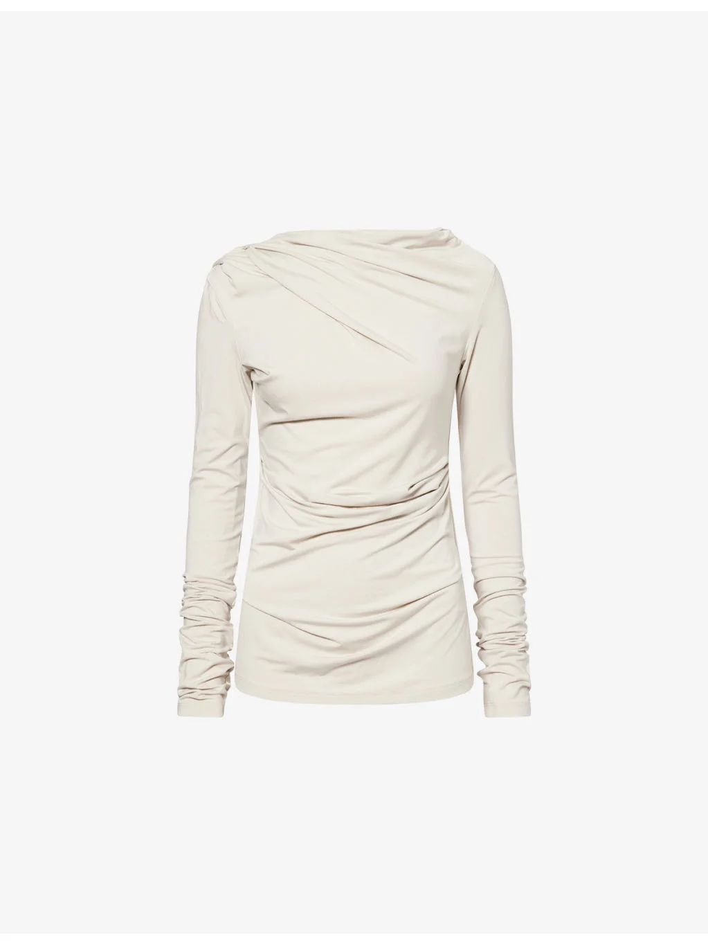 PRODUCT DETAILS - Entire Studios jersey top - 92% viscose, 8% elastane - Regular fit, high boat neck, long sleeves, draped ruching at front - Machine wash at 30°C - True to size - Model is 5ft 10in/1.78m and wears a size small - Lightweight, stretchy Ref: R04585555