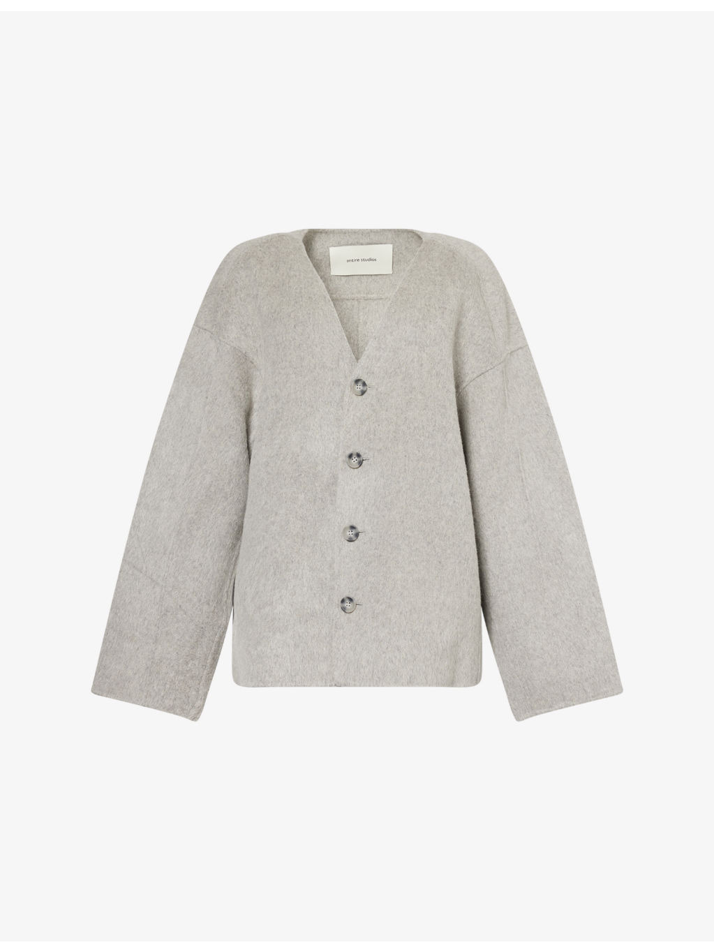 PRODUCT DETAILS - ENTIRE STUDIOS wool jacket - 100% wool - Exposed button fastening at front - Relaxed fit, V-neck, dropped shoulders, long sleeves, brushed, unlined - Dry clean - True to size - Size small: length 26in / 67cm - Model is 5ft 10in/1.78m and wears a size small - Midweight, stretchy Ref: R04480535