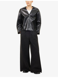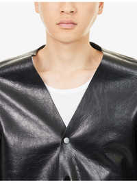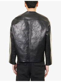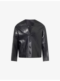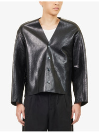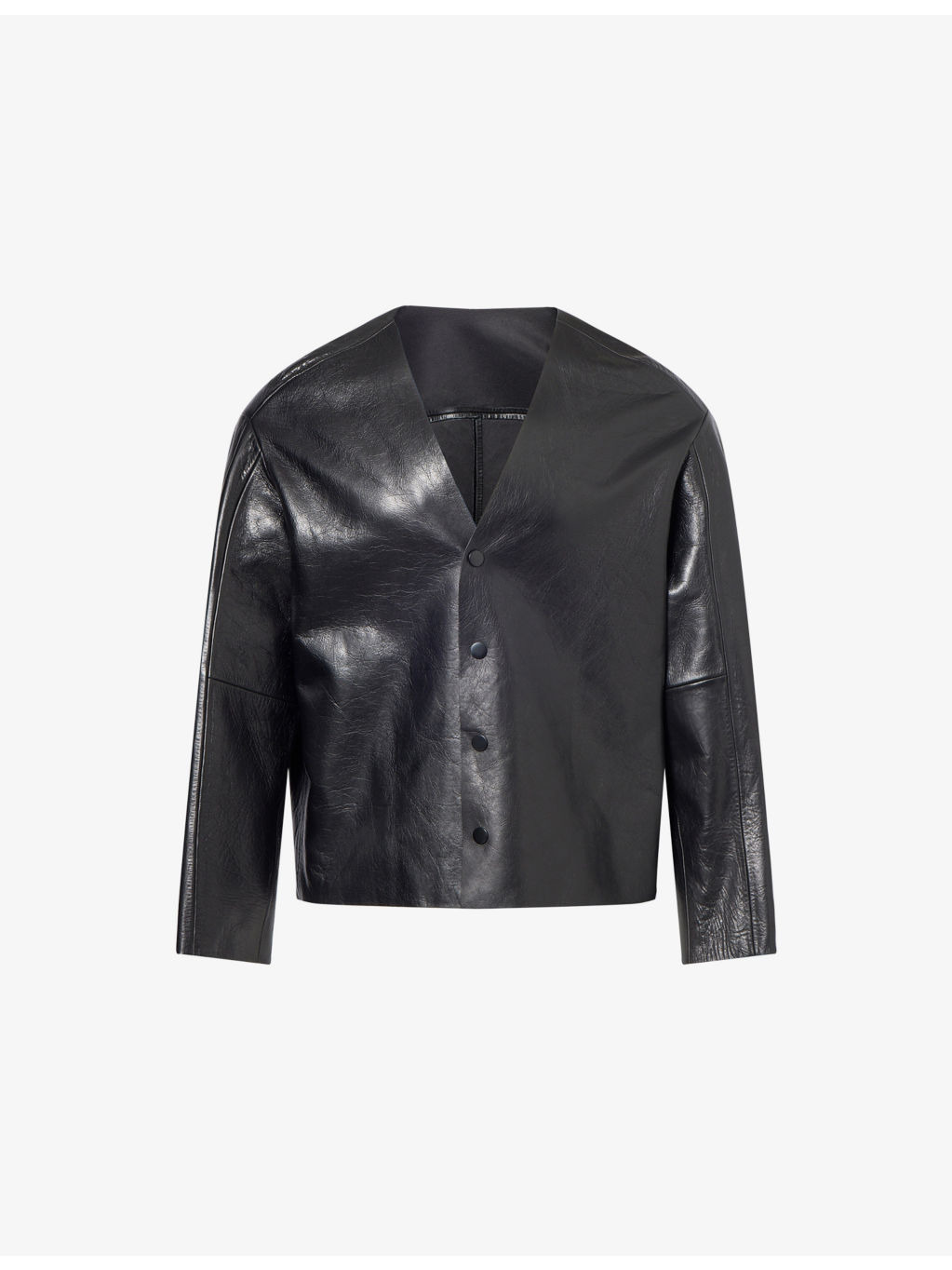 PRODUCT DETAILS - ENTIRE STUDIOS leather jacket - 100% cow leather - Pressed stud fastening at front - V-neck opening, long sleeves, all-over crinkle texture, straight hem - Specialist leather clean - Size medium: length 27.1in / 69cm, chest 45.2in / 115cm - Model is 6ft 2in/1.88m and wears a size medium - Midweight, non-stretch Ref: R04479880
