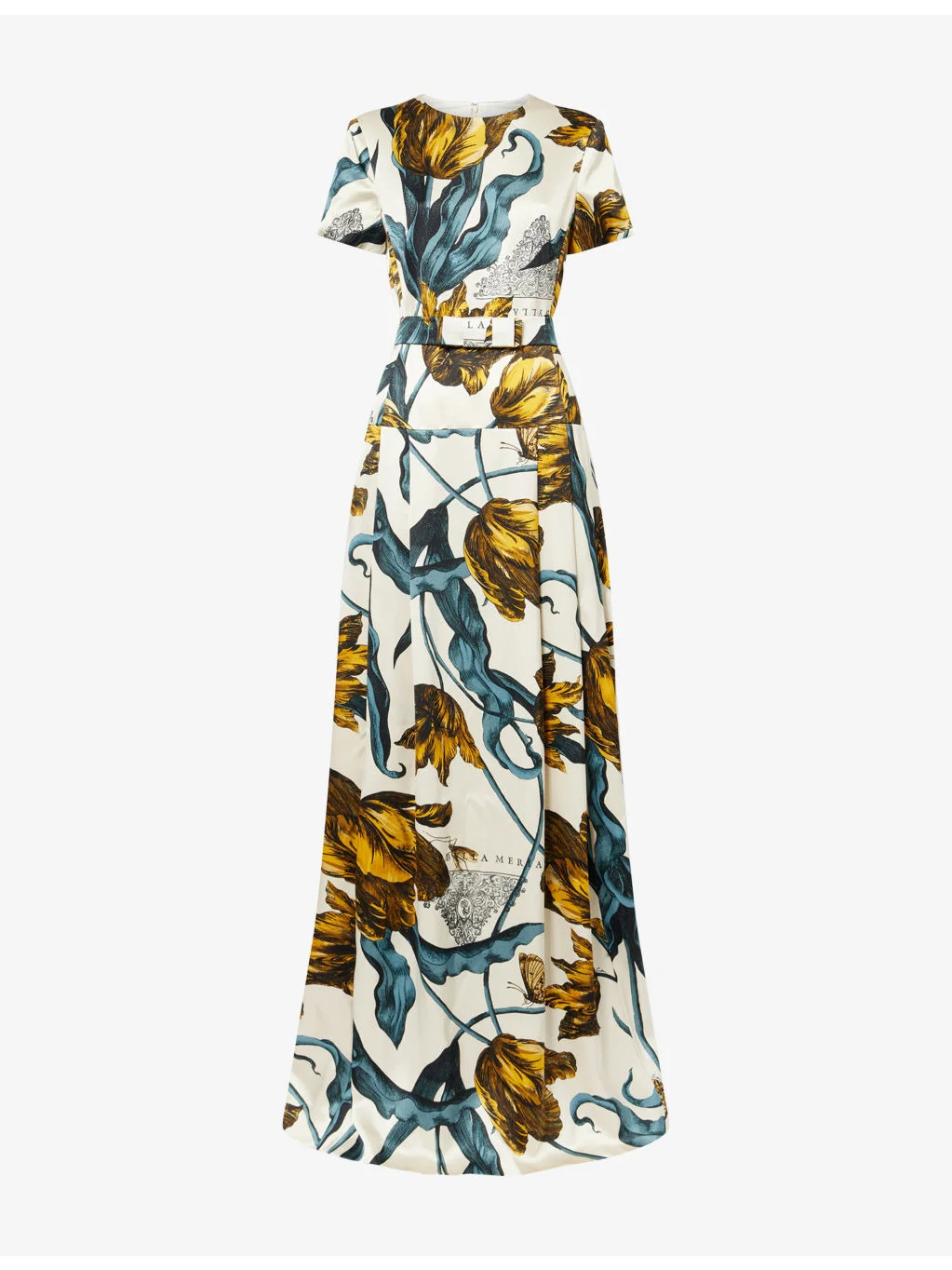 PRODUCT DETAILS - Erdem woven gown - 100% viscose; lining 73% acetate, 27% silk - Concealed zip fastening at back - Regular fit, round-neck, short sleeves, pleated at front, all-over tulip print, all-over satin texture, fully lined, flared hem - Dry clean - Made in UK - True to size - Size UK 8: length 63in / 160cm - Model is 5ft 10in/1.78m and wears a size UK 8 - Midweight, slight stretch Ref: R04563102