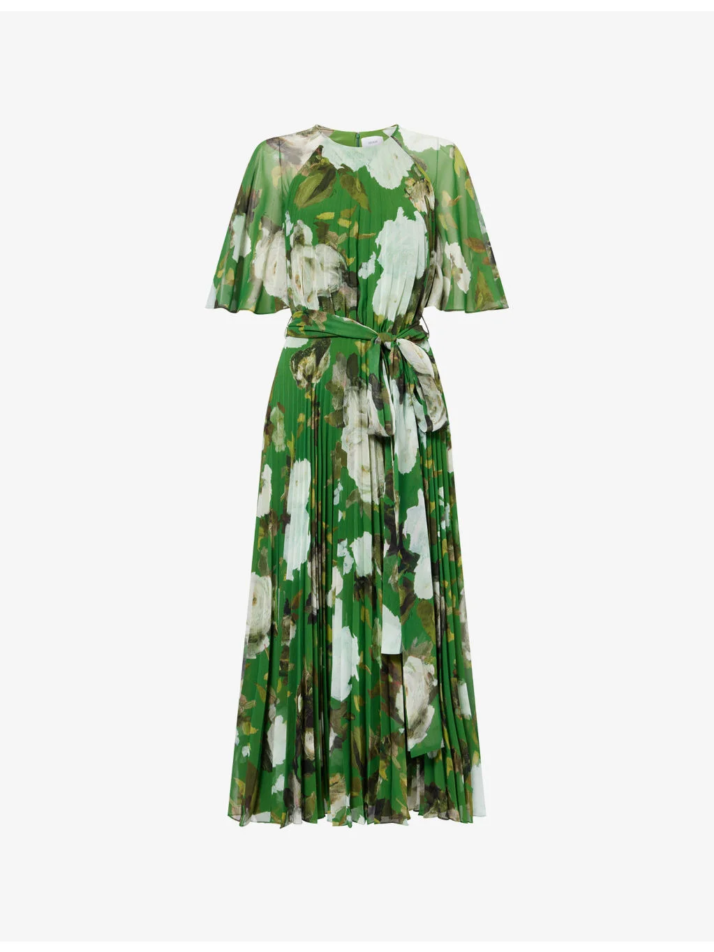 PRODUCT DETAILS - ERDEM Chiffon Midi Dress - 100% polyester; lining 100% silk - Zip fastening - Round neck, fluted short sleeves, pleated, belted, fully lined, floral print - Dry clean - True to size - Size UK10: length 50in / 127cm - Model is 5ft 10in / 1.78m and wears a size UK 10 - Midweight, non-stretch Ref: R04508109