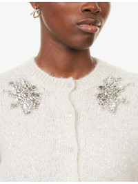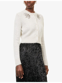 PRODUCT DETAILS - Erdem alpaca-blend cardigan - 70% alpaca, 30% polyamide; embroidery 60% glass, 30% brass, 10% acrylic - Exposed button fastenings at front - Regular fit, round neck, long sleeves, ribbed trims, hand-encrusted floral appliques, all-over sequin embellishments, cropped - Dry clean - Made in Romania - True to size - Model is 5ft 10in/1.78m and wears a size UK 8 - Midweight, stretchy Ref: R04544808