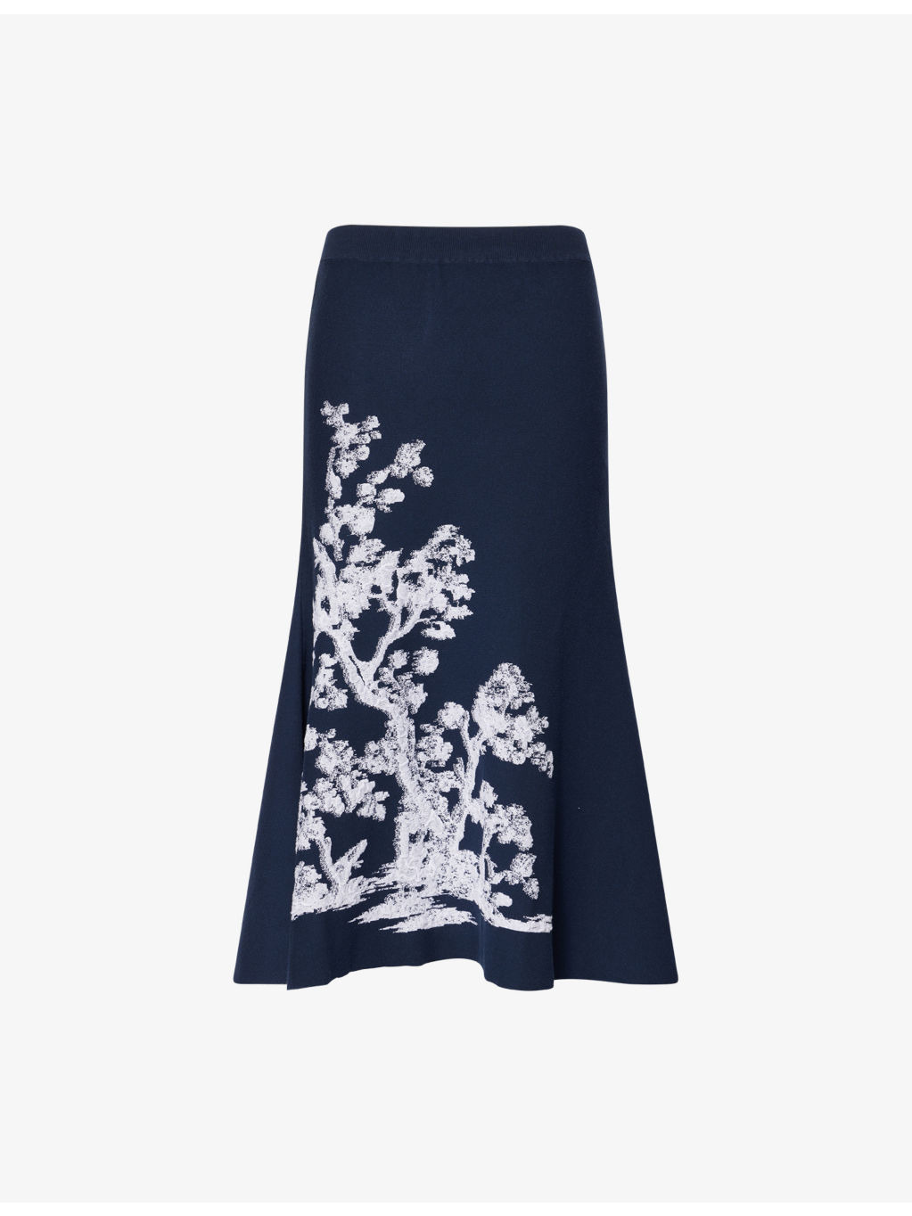 PRODUCT DETAILS - Erdem knitted midi skirt - 57% viscose, 25% polyester, 18% cotton - Regular fit, elasticated waistband, contrasting tree print at front, midi length, asymmetric silhouette, knitted - Machine wash at 40°C - True to size - Size small: length 31in / 79cm - Model is 5ft 10in/1.78m and wears a size small - Lightweight, stretchy Ref: R04508121