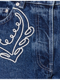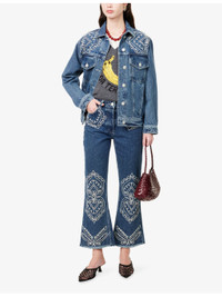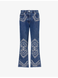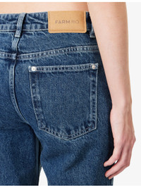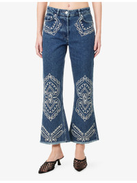 PRODUCT DETAILS - Farm Rio denim jeans - 100% cotton - Button and button-fly fastening - Regular fit, cropped leg, belt loops, five pockets, frayed hems, all-over embroidered motif at front, branded patch at back, branded hardware - Machine wash cold - Made in Turkey - True to size - Size 26: rise 10.5in / 26.6cm, inside leg 27in / 68.5cm, leg opening 20in / 50.6cm - Model is 5ft 10in/1.78m and wears a size 26 - Midweight, non-stretch Ref: R04573318