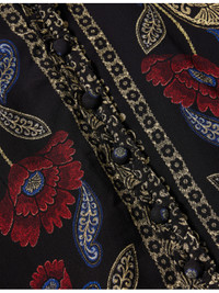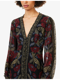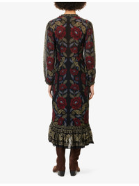 PRODUCT DETAILS - Farm Rio woven midi dress - 100% viscose; lining 100% viscose - Concealed zip fastening at side - Regular fit, V-neck, button fastening at front, long sleeves, elasticated cuffs, frilled trims, all-over floral print, contrast print at trims, flared hem, partially lined - Machine wash at 30°C - Made in India - True to size - Size small: length 49in/ 124.5cm - Model is 5ft 10in/1.78m and wears a size small - Lightweight, non-stretch Ref: R04558098