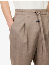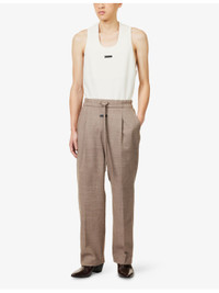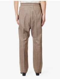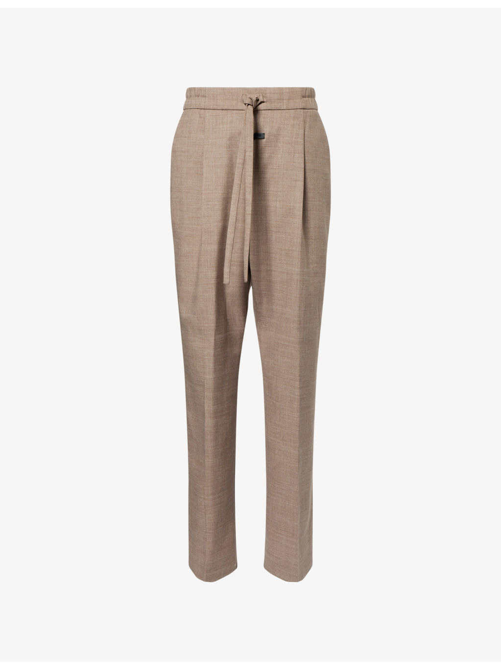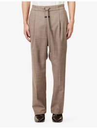 PRODUCT DETAILS - FOG x ESSENTIALS wool trousers - 100% wool - Self-tie fastening at waist - Straight leg, drawstring waist, partially elasticated at waist, de-bossed logo patch at front, two slip pockets at front, partially lined - Dry clean - Made in Italy - Size medium: rise 16.1in / 41cm, inside leg 30.7in / 78cm, leg opening 18.8in / 48cm - Model is 6ft 2in/1.88m and wears a size medium - Lightweight, non-stretch Ref: R04519805