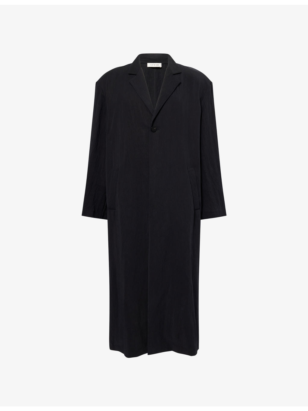 PRODUCT DETAILS - Fear of God woven overcoat - 93% lyocell, 7% polyamide - Button fastening - Relaxed fit, notch lapel, long sleeves, unlined, side pockets, slight texture to fabrication, brand tag at back neck - Dry clean - Size medium: length 56in / 142.2cm, chest 54in / 137cm - Model is 6ft 2in/1.88m and wears a size medium - Lightweight, non-stretch Ref: R04519822