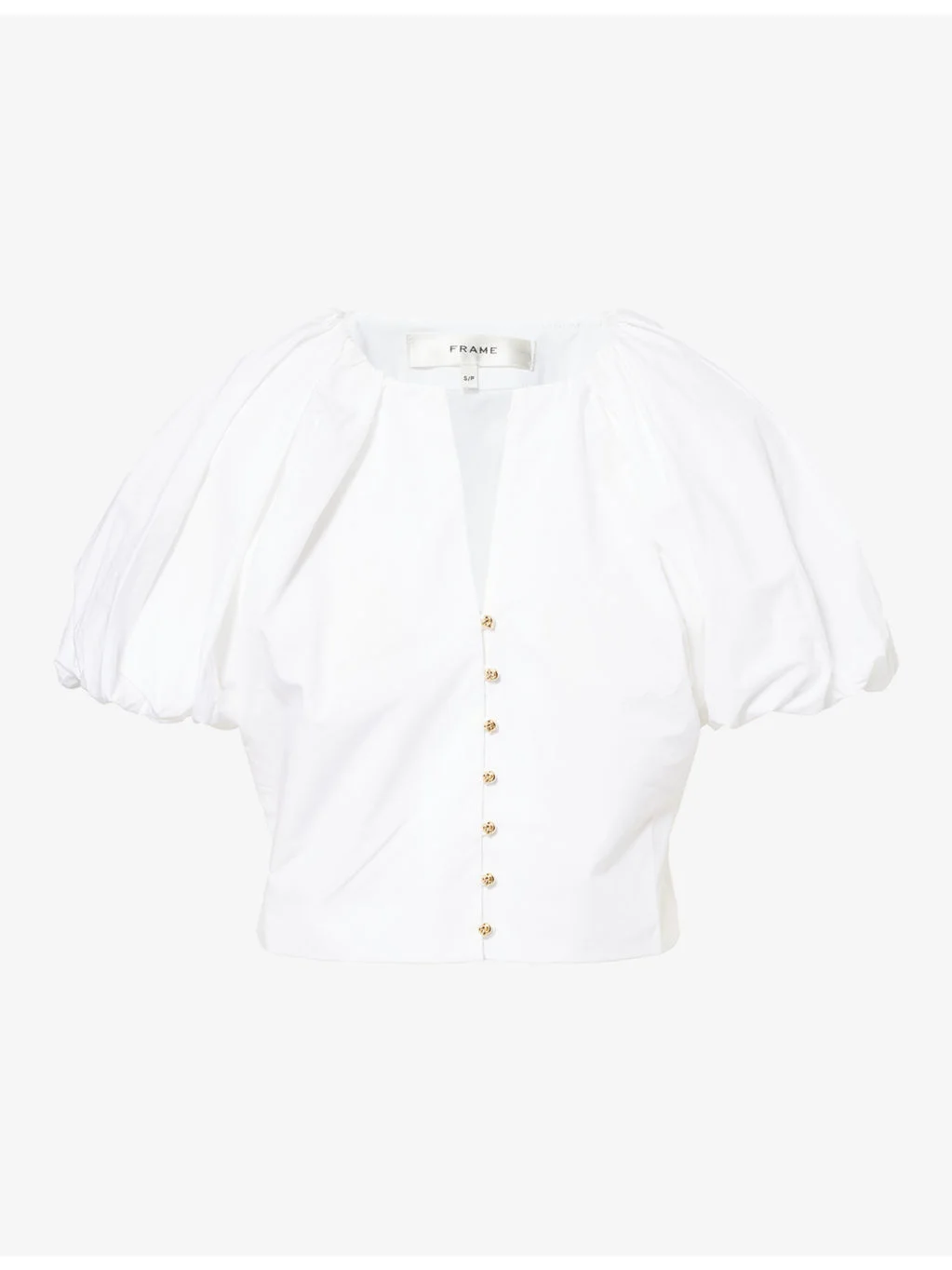 PRODUCT DETAILS - FRAME cotton-poplin blouse - 100% cotton - Exposed button fastening at front - Slim fit, cropped, round-neck, balloon short sleeves, knot design buttons - Machine wash cold - True to size - Size small: length 17in / 44cm - Model is 5ft 10in/1.78m and wears a size small - Lightweight, slight stretch Ref: R04538806