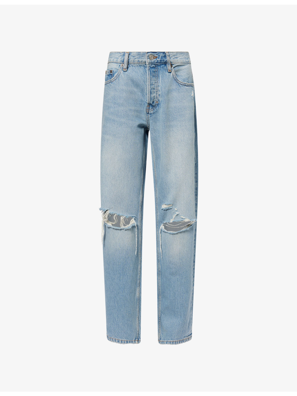 PRODUCT DETAILS - Frame dennim jeans - 100% cotton - Button and zip-fly fastening - Straight leg, mid-rise, belt loops, five pockets, all-over contrast top stitching, mid wash, frayed hems - Machine wash cold - Model is 6ft 2in/1.88m and wears a size UK 30 - Midweight, non-stretch Ref: R04510315