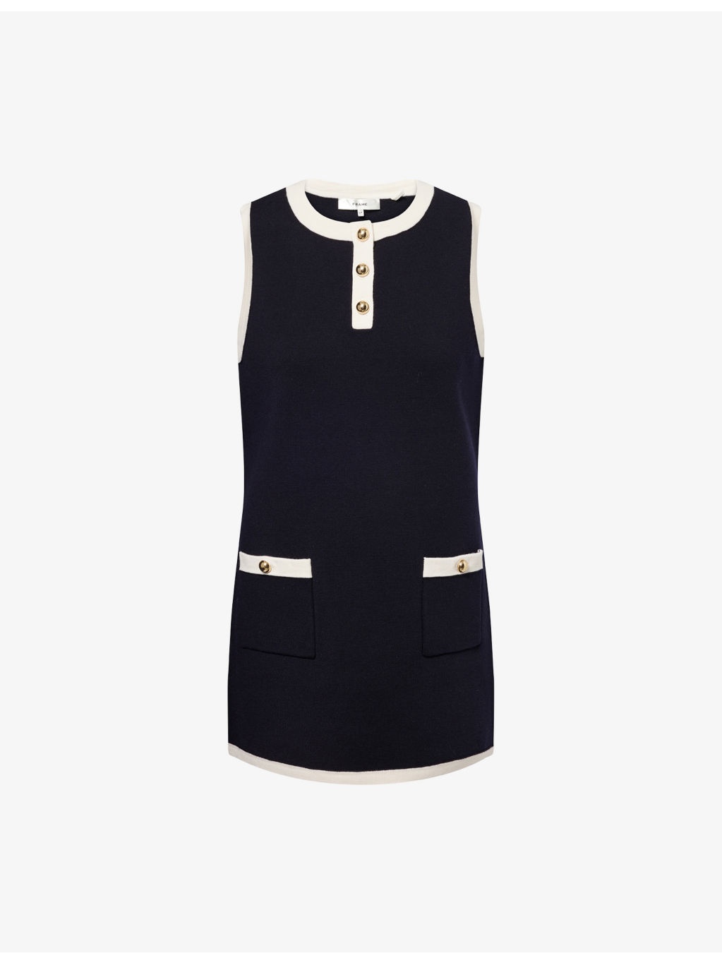 PRODUCT DETAILS - FRAME wool-blend knit mini dress - 80% wool, 19% polyamide, 1% elastane - Exposed button fastening at front - Regular fit, round neck, sleeveless, patch pockets at front, contrasting trims - Dry clean - True to size - Size small: length 32in / 81cm - Model is 5ft 10in/1.78m and wears a size small - Midweight, slight stretch Ref: R04461231