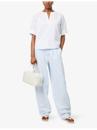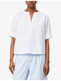 PRODUCT DETAILS - FRAME cotton-blend shirt - 89% cotton, 11% linen - Regular fit, V-neck, short sleeves with buttoned cuffs, all-over stripe print, straight hem with pleat at back - Machine wash cold - True to size - Model is 5ft 10in/1.78m and wears a size small - Lightweight, non-stretch Ref: R04461278