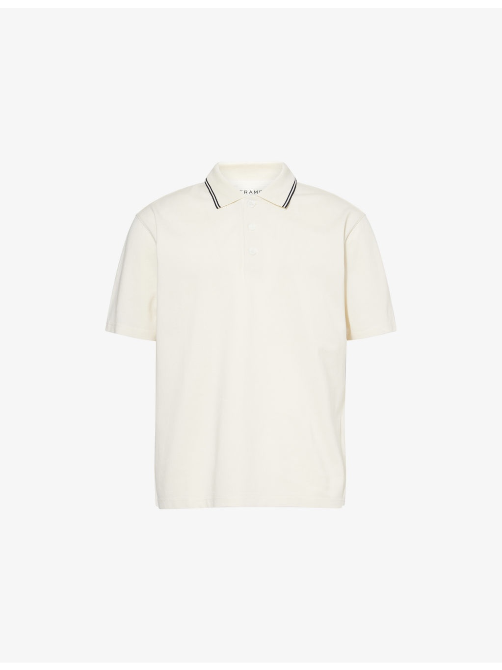 PRODUCT DETAILS - FRAME cotton pique polo top - 100% cotton - Exposed button fastening at front - Classic striped collar, short sleeves, all-over woven texture - Machine wash cold - Model is 6ft 1in/1.85m and wears a size UK 38 - Lightweight, slight stretch Ref: R04465408