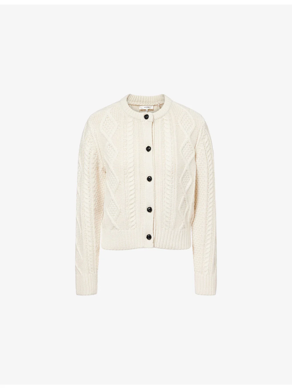 PRODUCT DETAILS - FRAME cashmere jumper - 100% cashmere - Regular fit, round neck, long sleeves, leather braided buttons, all-over cable knit, ribbed trims - Dry clean - True to size - Model is 5ft 10in/1.78m and wears a size small - Midweight, stretchy Ref: R04538773