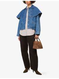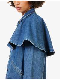 PRODUCT DETAILS - FRAME denim jacket - 100% cotton - Exposed popper fastenings at front - Relaxed fit, pointed collar, fixed cape, long wide sleeves, welt pockets at front, branded hardware, unlined - Machine wash cold - Made in Turkey - True to size - Size small: length 24.25in / 61.5cm - Model is 5ft 10in/1.78m and wears a size small - Midweight, non-stretch Ref: R04538779
