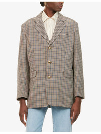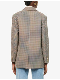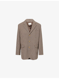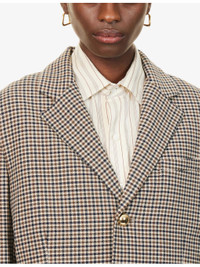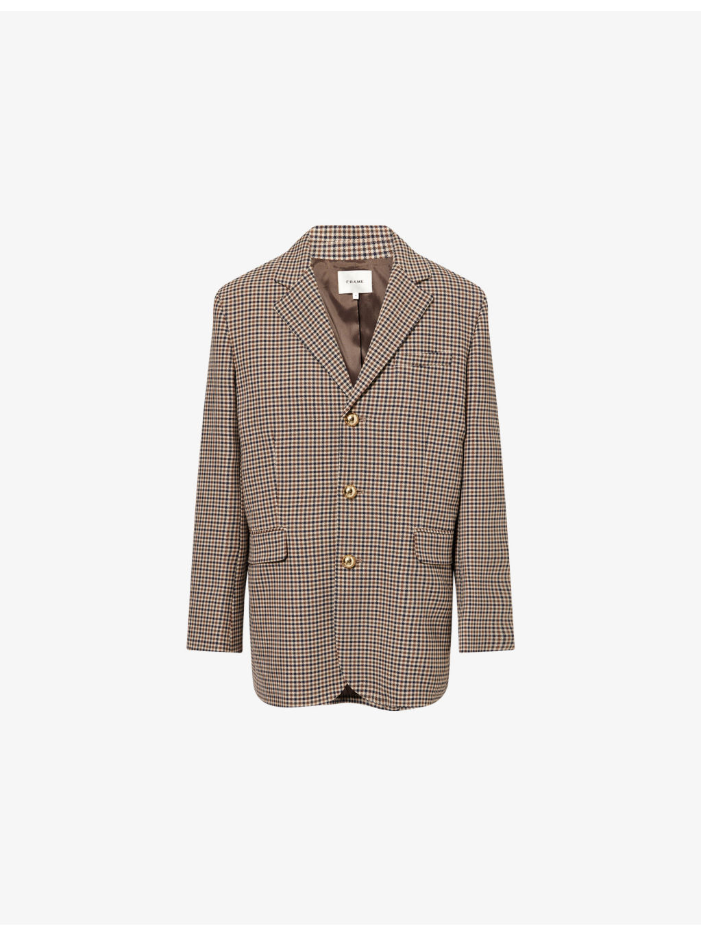 PRODUCT DETAILS - FRAME stretch-woven blazer - 52% polyester, 43% wool, 5% elastane; lining 63% viscose, 37% polyester - Exposed button fastening at front - Relaxed fit, single-breasted, notch lapels, padded shoulders, long sleeves, buttoned cuffs, welt pocket and two flap pockets at front, all-over houndstooth print, fully lined, single vent - Dry clean only - True to size - Size UK 8: length 30in / 76cm - Model is 5ft 10in/1.78m and wears a size UK 8 - Midweight, slight stretch Ref: R04509224