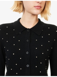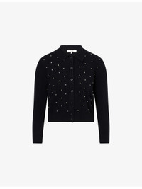PRODUCT DETAILS - FRAME wool-cashmere cardigan - 70% wool, 30% cashmere - Button fastening at front - Regular fit, polo collar, long sleeves, rhinestone embellishment at front and back - Dry clean only - True to size - Model is 5ft 10in/1.78m and wears a size small - Lightweight, slight stretch Ref: R04538776