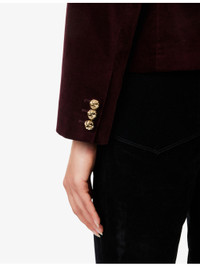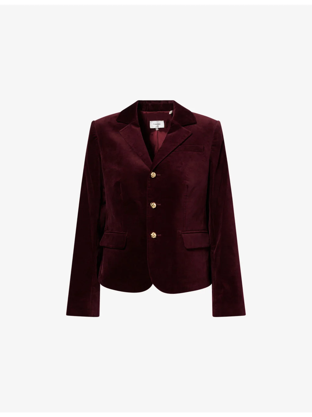 PRODUCT DETAILS - FRAME cotton-blend blazer - 97% cotton, 3% elastane; lining 63% viscose, 37% polyester - Exposed button fastenings at front - Fitted, notched lapels, one welt pocket at chest, shoulder pads, long sleeves, two flap pockets at front, woven-effect gold tone buttons at front and cuffs, straight hem, fully lined - Dry clean - Made in Turkey - True to size - Size UK 8: length 26in / 66cm - Model is 5ft 10in/1.78m and wears a size UK 8 - Midweight, non-stretch Ref: R04538814