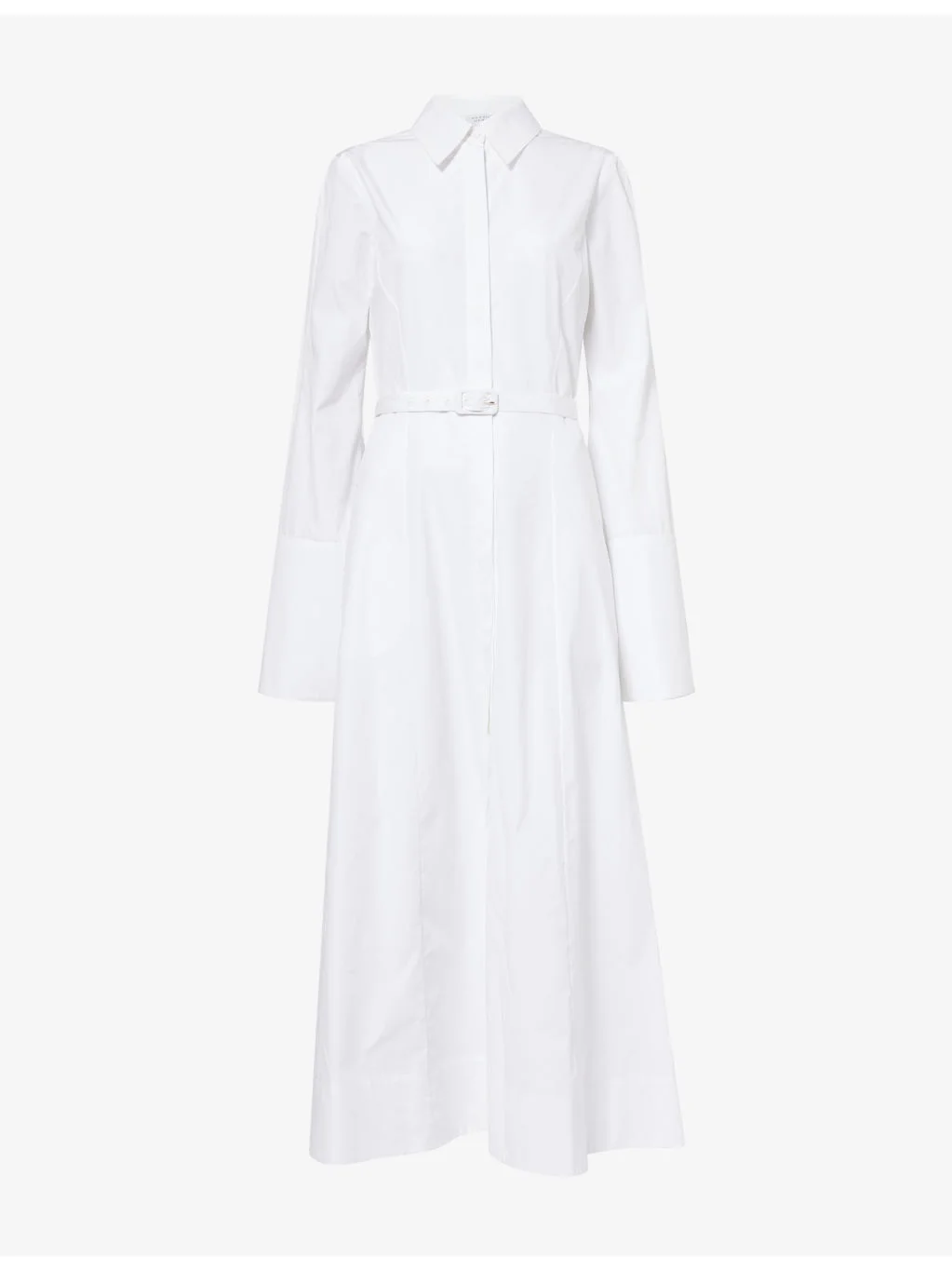 PRODUCT DETAILS - Gabriela Hearst cotton midi dress - 100% cotton - Button fastening - Regular fit, classic collar, long sleeves, elongated wide buttoned cuffs, adjustable belt at waist, slip pockets at sides, unlined, covered placket - Dry clean - Made in Italy - True to size - Size UK 8: length 55in / 140cm - Model is 5ft 10in/1.78m and wears a size UK 8 - Lightweight, non-stretch Ref: R04581611