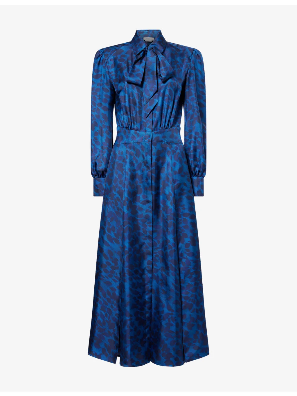 PRODUCT DETAILS - Gabriela Hearst silk midi dress - 100% silk - Concealed button fastenings at front - Regular fit, bow collar, padded shoulders, long sleeves, buttoned cuffs, side slip pockets, all-over graphic pattern - Dry clean - Made in Italy - True to size - Size UK 10: length 55in / 140cm - Model is 5ft 10in / 1.78m and wears a size UK 10 - Lightweight, non-stretch Ref: R04576166