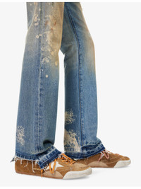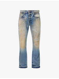 PRODUCT DETAILS - GALLERY DEPT. denim jeans - 100% cotton - Exposed button and concealed button-fly fastenings at front - Straight leg, mid-rise, belt loops, classic five pockets, brand patch at back, silver-toned hardware, all-over greased effect, bleached splatter, embroidered detailing, distressed hem - Dry clean - Made in USA - Size UK 30: rise 11in / 28cm, inside leg 32.2in / 82cm, leg opening 18.1in / 46cm - Model is 6ft 2in/1.88m and wears a size UK 30 - Midweight, non-stretch Ref: R04480646