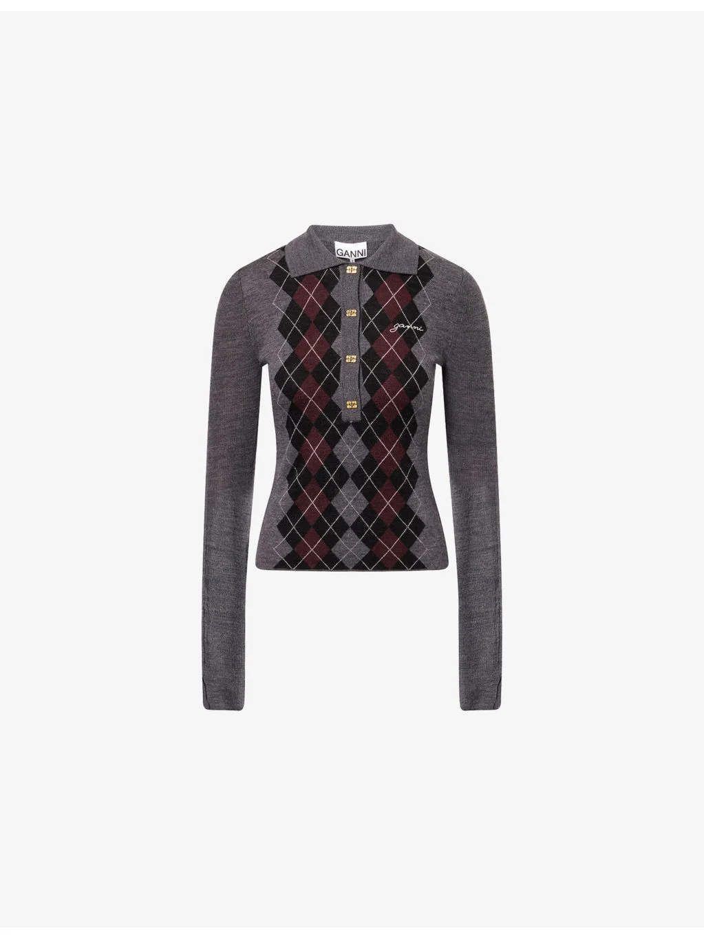 PRODUCT DETAILS - GANNI wool jumper - 100% wool - Button fastening at front - Slim fit, polo collar, long sleeves, embroidered logo at chest, argyle pattern at front - Hand wash - True to size - Model is 5ft 10in/1.78m and wears a size small - Midweight, slight stretch Ref: R04575321