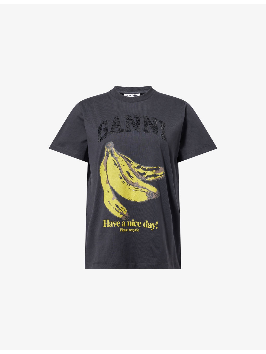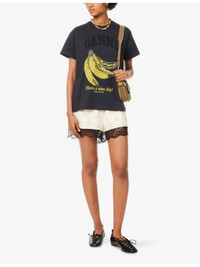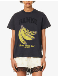 PRODUCT DETAILS - GANNI cotton-jersey T-shirt - 100% cotton - Relaxed fit, ribbed round-neck, short sleeves, rhinestone branding and banana print at front - Machine wash at 30°C - Made in Portugal - True to size - Model is 5ft 10in/1.78m and wears a size small - Lightweight, stretchy Ref: R04472292