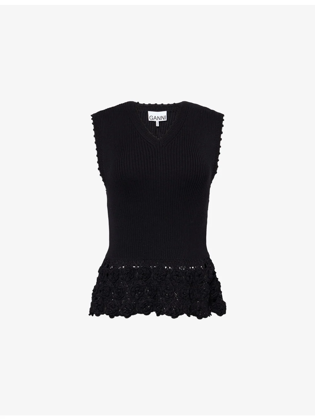 PRODUCT DETAILS - GANNI cotton-rib vest - 90% cotton, 10% polyamide - Regular fit, v-neck, sleeveless, cotton-rib stretch knit, crochet trims - Hand wash - True to size - Model is 5ft 10in/1.78m and wears a size small - Midweight, stretchy Ref: R04605346