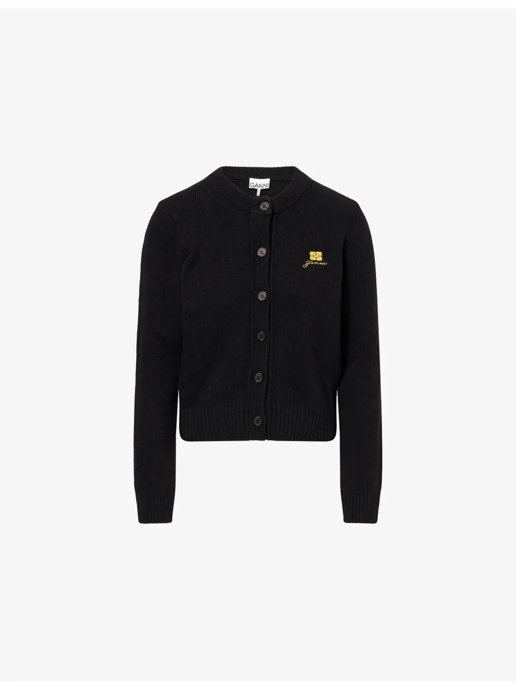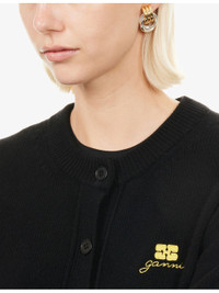 PRODUCT DETAILS - GANNI wool-blend cardigan - 60% wool, 40% viscose - Exposed button fastening at front - Regular fit, round-neck, long sleeves, monogram embroidery at front, all-over knitted, ribbed trims - Hand wash cold - True to size - Size small: length 22in / 56cm - Model is 5ft 10in/1.78m and wears a size small - Midweight, stretchy Ref: R04574979