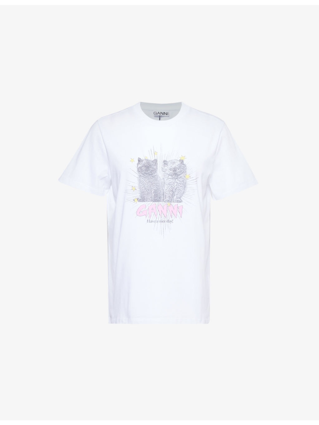 PRODUCT DETAILS - GANNI organic-cotton jersey T-shirt - 100% organic cotton - Slips on - Relaxed fit, round neck, ribbed trim at neck, short sleeves, graphic print at front - Machine wash cold - Made in Portugal - True to size - Model is 5ft 10in/1.78m and wears a size small - Lightweight, slight stretch Ref: R04390911