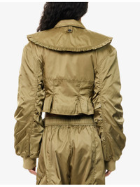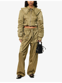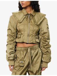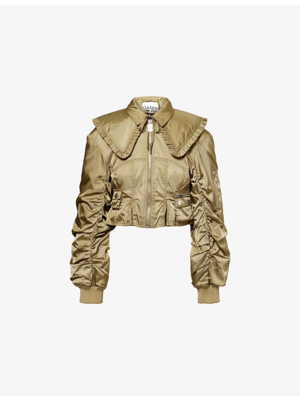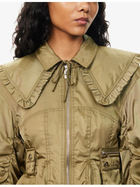 PRODUCT DETAILS - GANNI woven bomber jacket - 93% polyamide, 7% polyurethane - Fitted, cropped, round collar, long sleeves, zip and patch pockets at front, ribbed trims, flared hem at back, detachable snap collar - Dry clean - True to size - Size small. length 18in / 45.7cm - Model is 5ft 10in/1.78m and wears a size UK 8 - Midweight, non-stretch Ref: R04472275