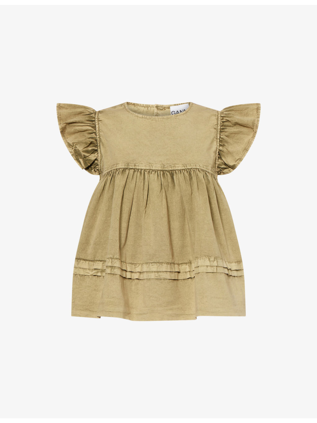 PRODUCT DETAILS - GANNI stretch-cotton top - 97% cotton, 3% elastane - Exposed button fastening at back - Relaxed fit, round-neck, ruffled cap sleeves, pleated panels, flared hem - True to size - Made In India - Machine wash cold - Size UK 8: length 22in / 56cm - Model is 5ft 10in/1.78m and wears a size UK 8 - Lightweight, stretchy Ref: R04472278