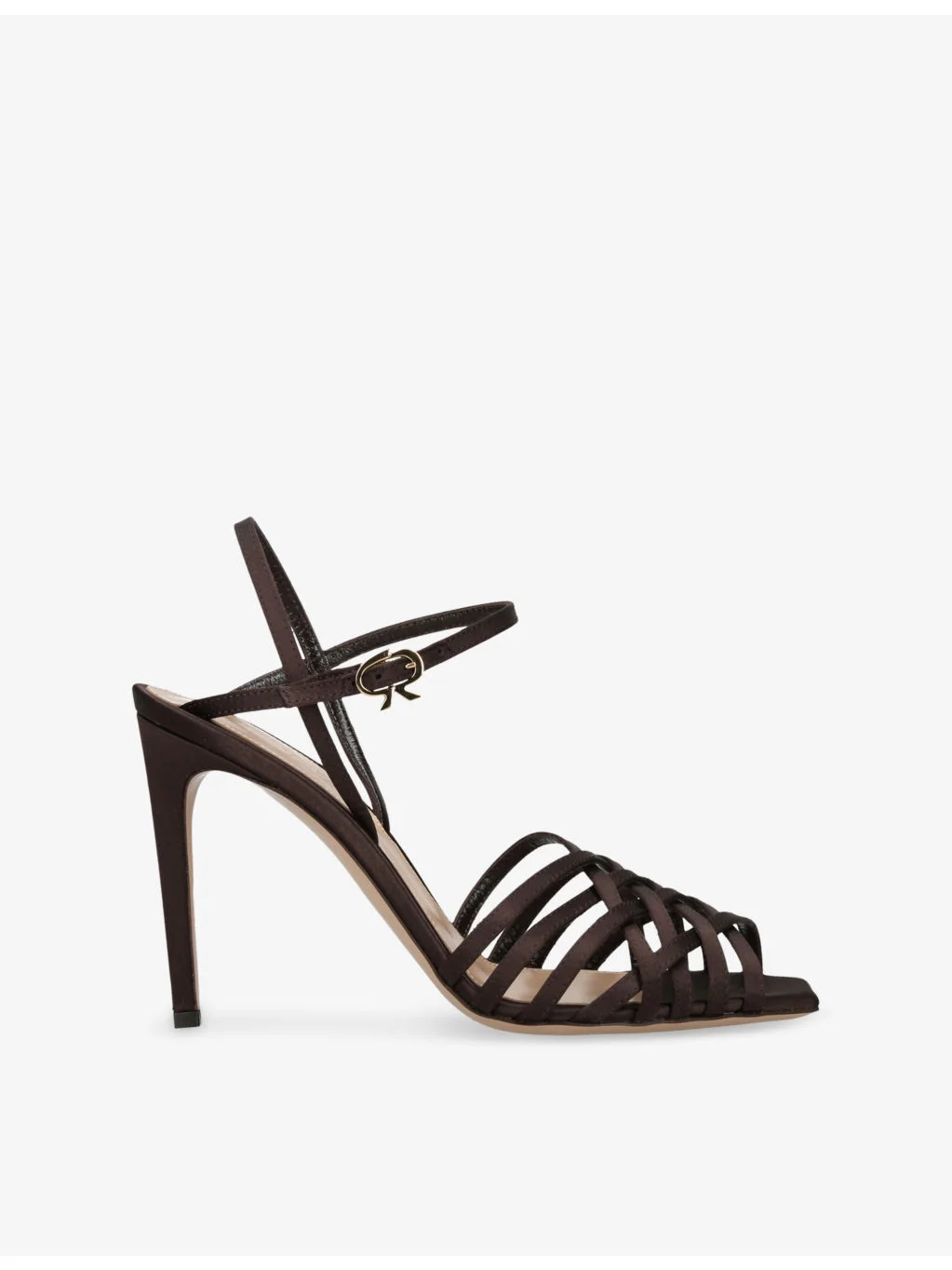 PRODUCT DETAILS - Gianvito Rossi satin heels - 100% satin - Ankle-buckle fastening - Closed square toe, woven criss-cross design, stiletto heel, branded footed - Heel height 9.5cm - Wipe with a clean, dry cloth - Made in Italy - Upper: 100% satin - Lining: 100% leather - Sole: 100% leather Ref: R04535557