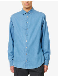 PRODUCT DETAILS - Emporio Armani denim shirt - 100% cotton - Exposed button fastening at front - Regular-fit, pointed collar, long sleeves, buttoned cuffs, branded mother-of-pearl buttons at front, curved hem, topstitch detailing - Machine wash at 30°C - Made in Italy - Size UK 40: length 31.8in / 81cm, chest 42.5in / 108cm - Model is 6ft 2in/1.88m and wears a size UK 40 - Lightweight, non-stretch Ref: R04485160