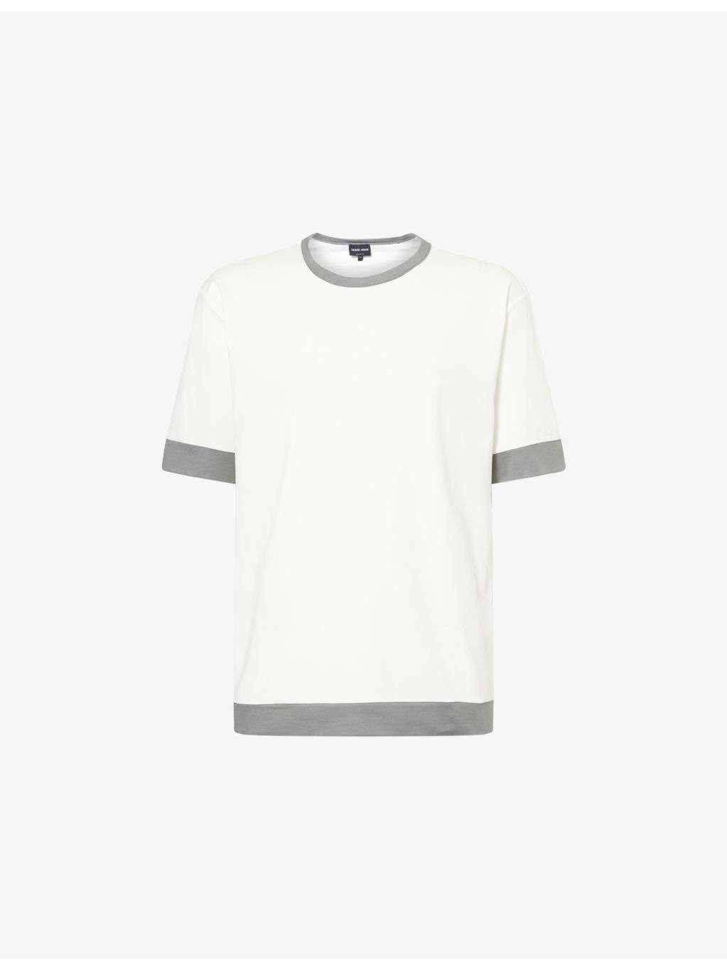 PRODUCT DETAILS - Giorgio Armani cotton t-shirt - 100% cotton - Boxy-fit, crewneck, short sleeves, ribbed contrast trims - Machine wash cold - Made in Italy - Model is 6ft 2in/1.88m and wears a size UK 38 - Lightweight, non-stretch Ref: R04485156