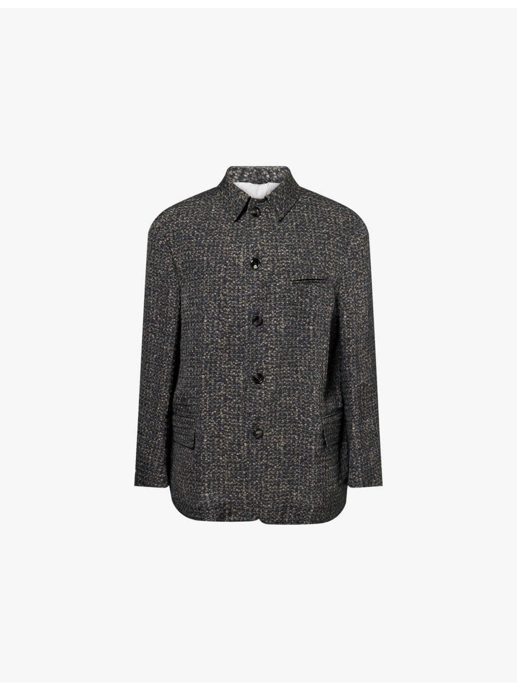 PRODUCT DETAILS - Georgio Armani woven blazer jacket - 100% cupro; lining 100% viscose - Single breasted, shirt collar, long sleeves, buttoned cuffs, two flap pockets at front, one welt pocket at chest, all-over graphic print design - Dry clean only - Made in Italy - Size medium: length 32.2in / 82cm, chest 49.6in / 126cm - Model is 6ft 2in/1.88m and wears a size UK 40 - Lightweight, non-stretch Ref: R04485162