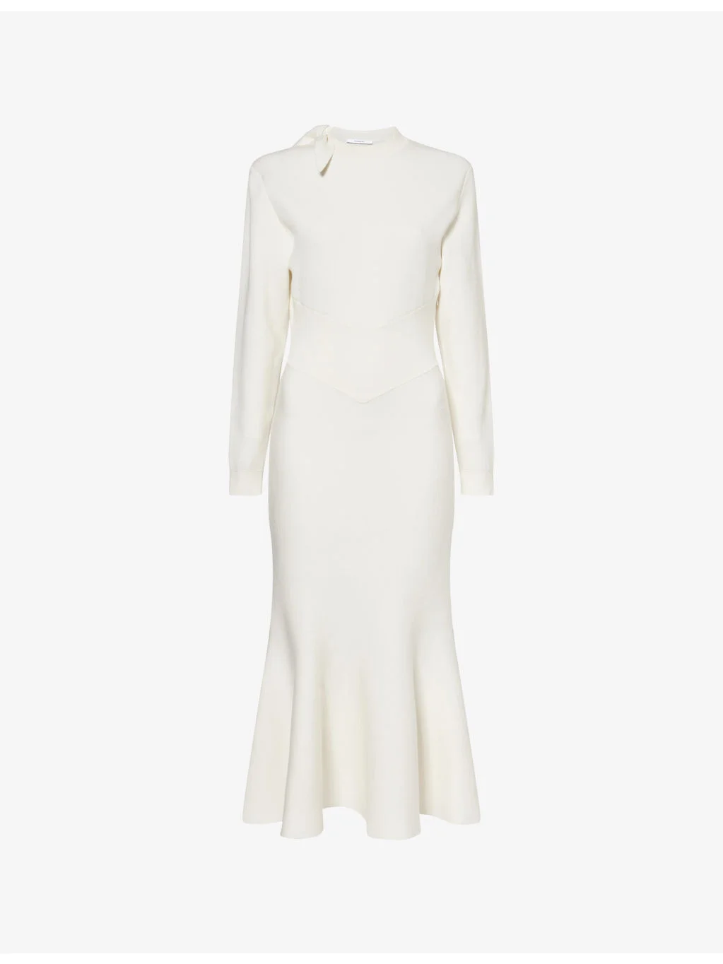 PRODUCT DETAILS - Givenchy wool and cotton-blend midi dress - 44% wool, 42% cotton, 13% polyamide, 1% elastane; embroidery 35% polyester, 29% wool, 28% cotton, 8% polyamide - Concealed zip fastening at side - Regular fit, round neck, removable bow embroidery at collar, long sleeves, elasticated waist, ribbed trims, flared skirt, midi length, knitted - Dry clean - Made in Italy - True to size - Size UK 8: length 52in / 132.5cm - Model is 5ft 10in/1.78m and wears a size UK 8 - Midweight, slight stretch Ref: R04557412