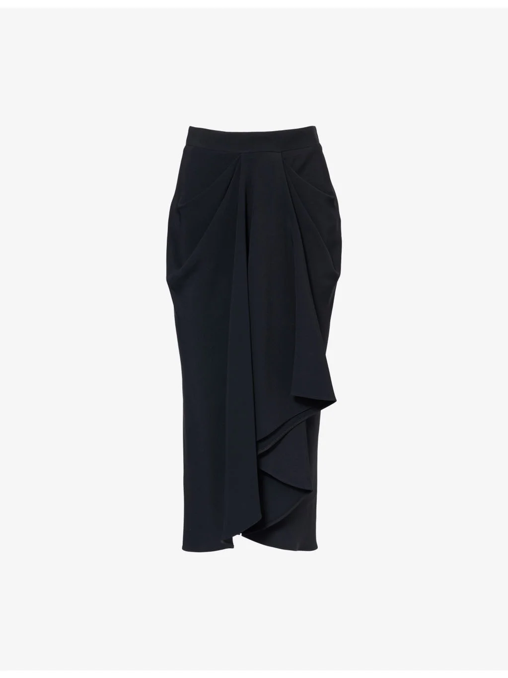 PRODUCT DETAILS - Givenchy crepe midi skirt - 65% viscose, 32% acetate, 3% elastane; lining 74% acetate, 26% silk - Concealed zip fastening at back - Regular fit, mid-rise, midi length, draped ruching at front, asymettric hem, unlined - Dry clean - Made in Italy - True to size - Model is 5ft 10in/1.78m and wears a size UK 8 - Lightweight, non-stretch Ref: R04557413