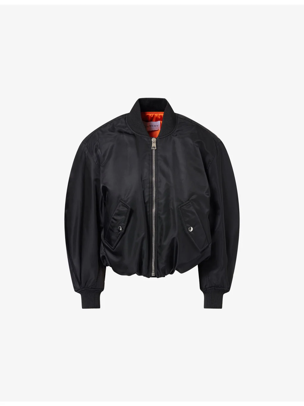 PRODUCT DETAILS - Givenchy shell bomber jacket - 100% polyamide; filling 100% polyester - Zip fastening - Relaxed fit, cropped length, round neck, long sleeves, dropped shoulders, elasticated ribbed trims, two pockets at front, two pockets at interior, fully lined - Dry clean - Made in Portugal - True to size - Size UK 8: length 22in / 55.8cm - Model is 5ft 10in/1.78m and wears a size UK 8 - Midweight, non-stretch Ref: R04557357