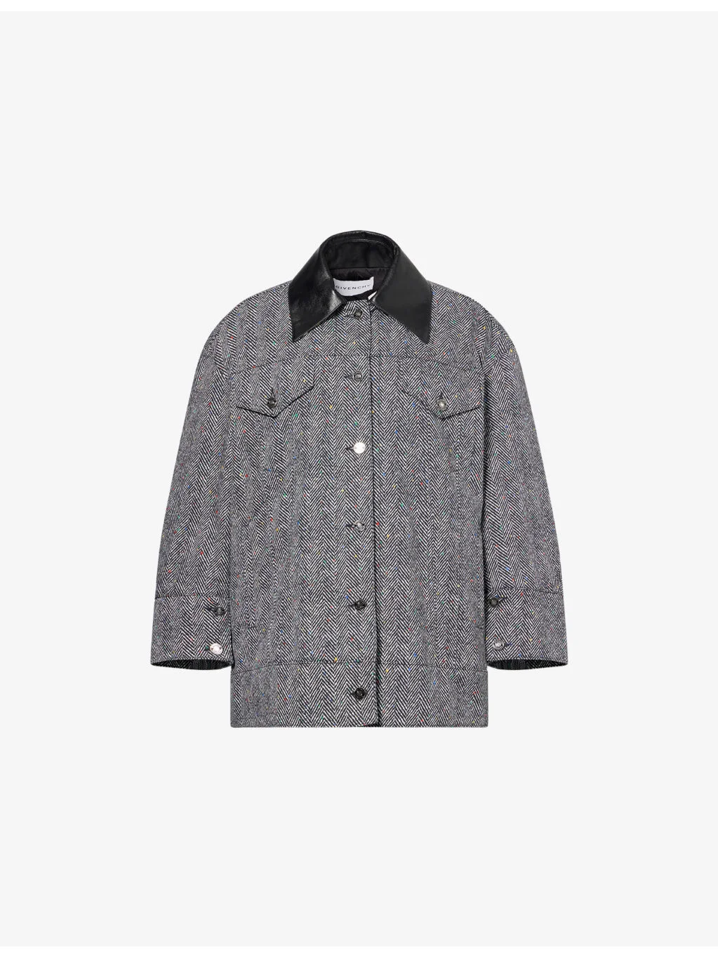 PRODUCT DETAILS - Givenchy cotton jacket - 100% cotton; contrast 100% calf leather; lining 100% polyamide - Exposed button fastening at front - Relaxed fit, leather spread collar, long sleeves, buttoned cuffs, two buttoned pockets and two welt pockets at front, two buttoned epaulettes at back, all-over herringbone print, fully lined - Specialist leather clean - Made in Italy - True to size - Size UK 6: length 28in / 72cm - Model is 5ft 10in/1.78m and wears a size UK 6 - Midweight, non-stretch Ref: R04512006