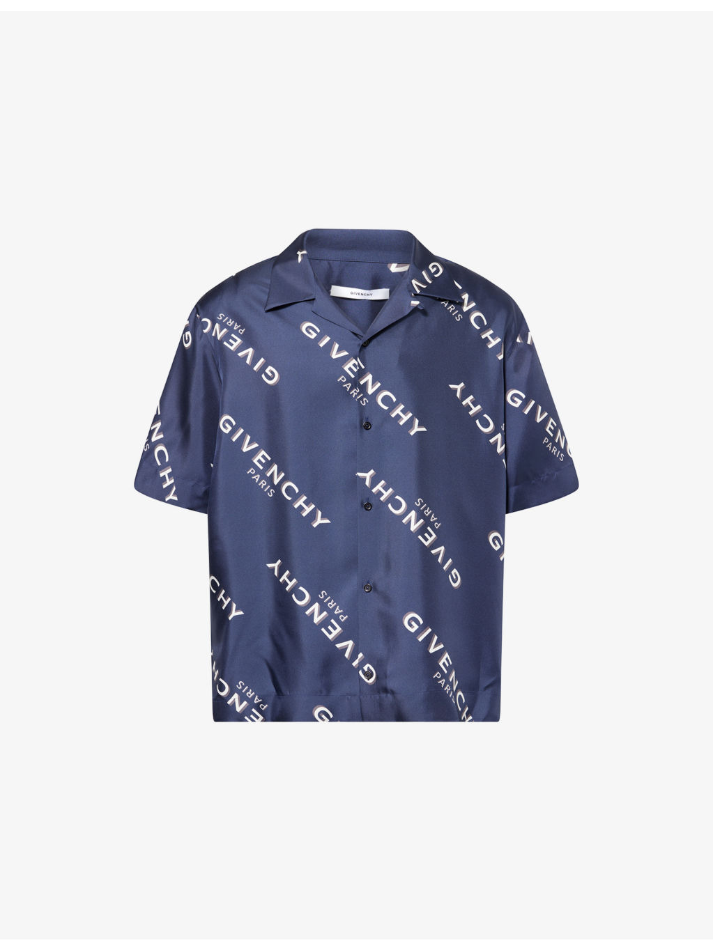 PRODUCT DETAILS - Givenchy silk shirt - 100% silk - Button fastening at front - Regular fit, camp collar, short sleeves, all-over logo pattern - Dry clean - Made in Italy - Collar size 16: length 28in / 72cm, chest 51in / 130cm - Model is 6ft 2in / 1.88m and wears a collar size 16 - Lightweight, non-stretch Ref: R04480873