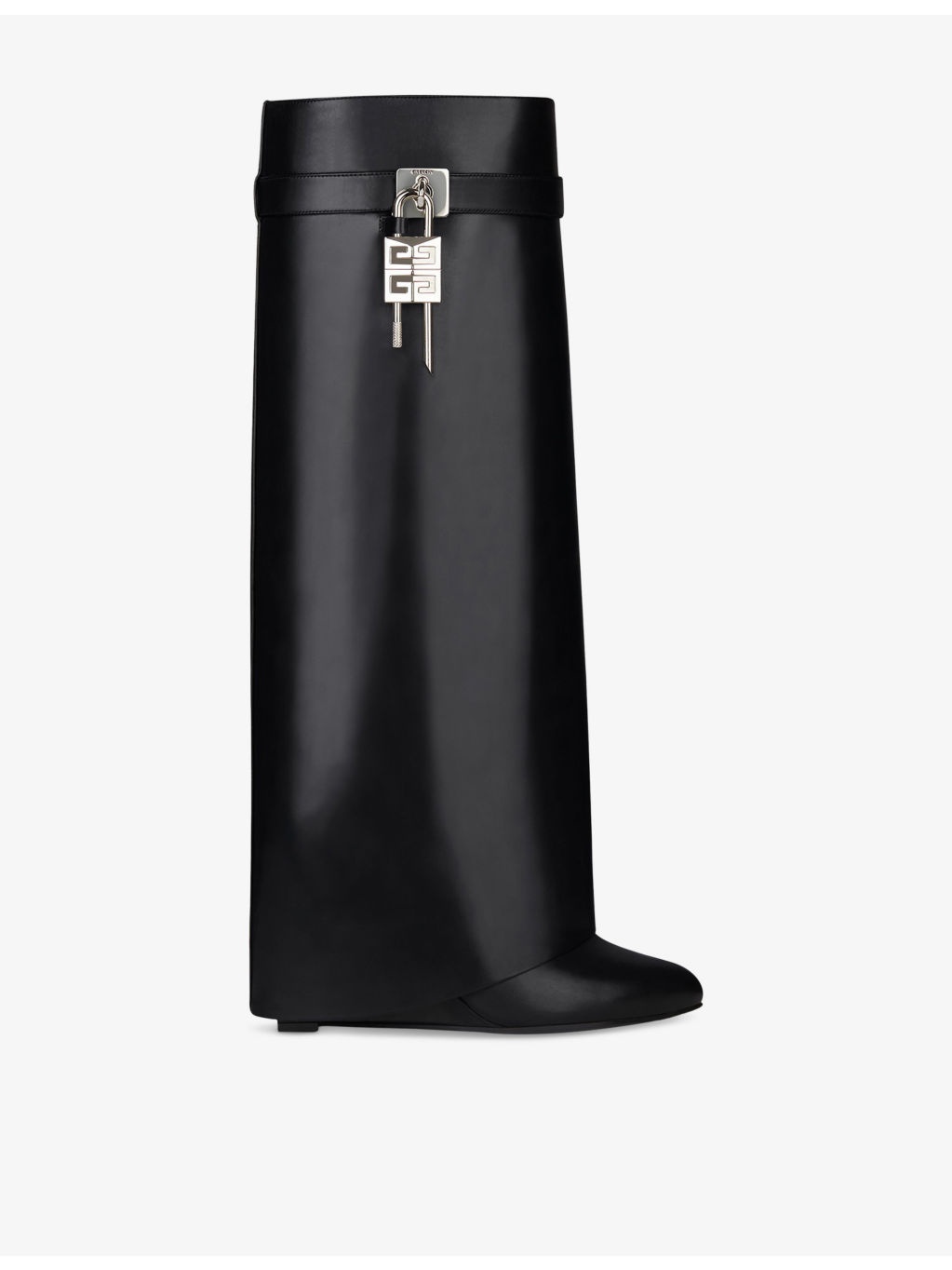 PRODUCT DETAILS - Givenchy leather boots - 100% leather - Closed almond toe, knee high, overlay design, covered wedge heel, Givenchy metal clasp, 4G padlock at sides - Heel height 3.5in - Specialist leather clean - Made in Italy - Upper: 100% leather - Lining: 100% leather - Sole: 100% leather Ref: R04290407
